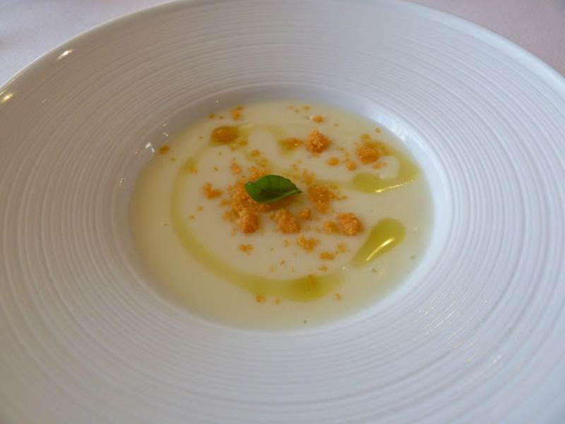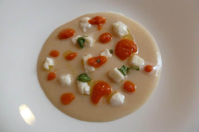 I sapori di terra e di mare, crema di patate, crumble di pomodoro essiccato e basilico
