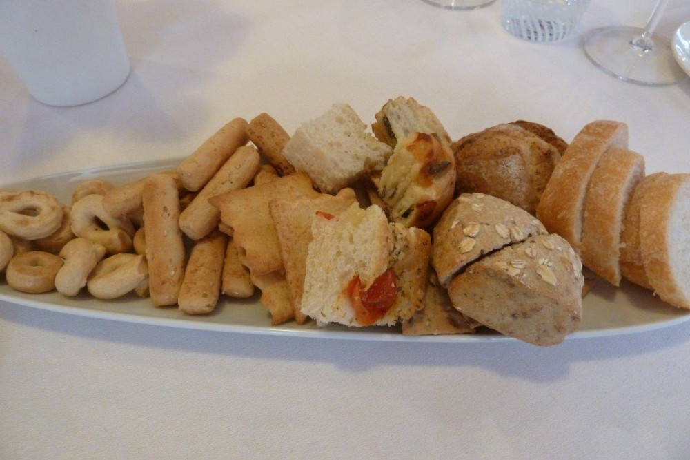 Pane, pane integrale, pane alle olive, grissini, crostini, taralli, pizza, focaccia, il forno si presenta bene e più volte nel corso del pranzo.