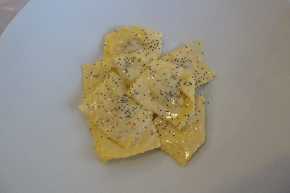 Ravioli, speck, salsa di zafferano e semi di papavero