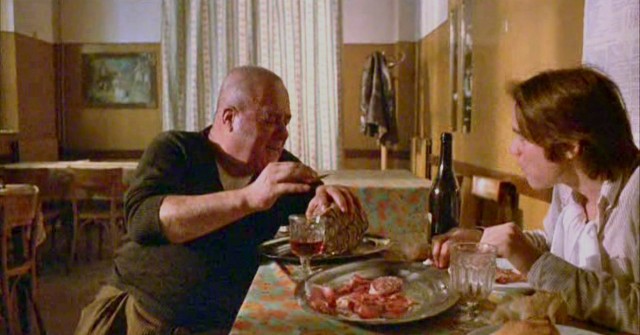 Campanini tornerà in Novecento (1976) e nel controverso La luna (1979), ancora ad affettare salumi e annusare culatelli, stavolta oste (ovviamente melomane) in una sperduta osteria dalle parti di Busseto, intento a far scoprire all’adolescente eroinomane Joe (Matthew Barry) le delizie del salume per eccellenza, accompagnato da un buon vino bianco. Campanini è per Bertolucci una sorta di divinità minore della buona tavola, impegnato com’è a dispensare conoscenza e felicità in un mondo che ne ha disperatamente bisogno. Perché la tavola crea intimità, e condividerla implica fiducia e complicità, come quella che nasce in La tragedia di un uomo ridicolo (1981) tra l’industriale Primo Spaggiari (Ugo Tognazzi) e l’”operaio-prete” (Victor Cavallo) che fa da tramite coi rapitori del figlio, seduti sotto il pergolato di una trattoria di collina. Qui lo stare a tavola insieme è gesto che annulla la differenza di classe: il contrario di quanto avviene in Novecento (1976), dove la differenza tra la tavolata allargata del mezzadro Leo Dalcò (Sterling Hayden) e quella tutta argenti e porcellane della famiglia padronale di Alfredo Berlinghieri (Burt Lancaster) è esemplificata in due sequenze speculari (i contadini alle prese con fumante polenta ridono, scherzano e riflettono amaramente sul loro status di servi, i padroni piluccano rane fritte in un’atmosfera fredda e scostante) in cui è chiaro da che parte stiano le simpatie, anche gastronomiche, del regista.
