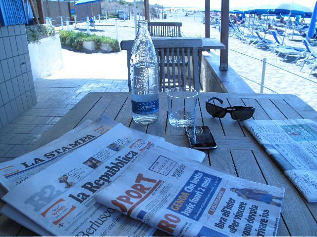 Allora, è presto mi metto fuori a bere un poco d’acqua e lettura dei giornali con vista sulle bellezze (?????) al bagno.