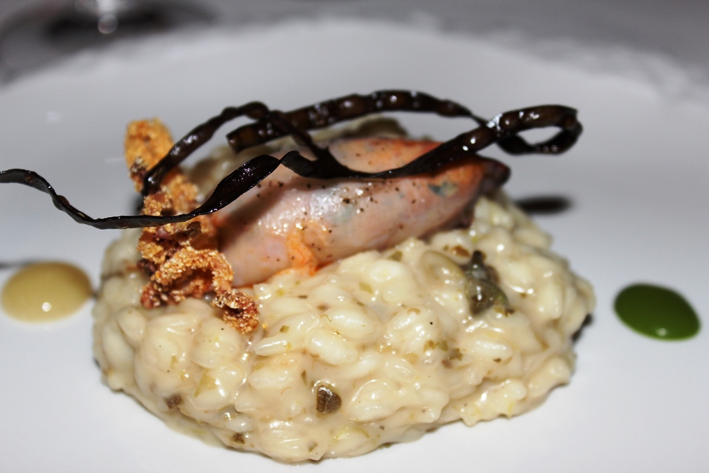Le esperienze di Andrea in cucine importanti si vedono anche nel risotto. La notizia è che si tratta di un risotto vero, giusto nella cottura; il riso è amalgamato, ben sgranato, forse un po’ troppo sapido. Il gusto del mare si sente, però è troppo violento.