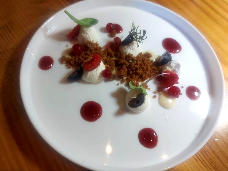 Chiude il pasto la cheesecake scomposta ai frutti di bosco in cui la grassezza e la spinta di acidità creano un vivace contrasto compensandosi a vicenda.