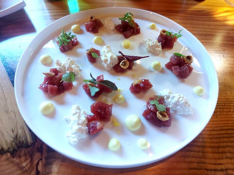Fresca e delicata la tartare di tonno rosso, stracciatella di bufala, nocciola emayo al limone pane con l’agrume che rinfresca e pulisce bene il palato preparandolo alla portata successiva. Freschezza che, insieme alla croccantezza, è protagonista anche del successivo antipasto, carpaccio di tonno al vapore con brunoise di verdurine, mandorla e avocado.