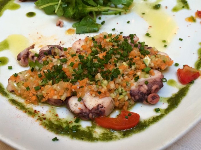 Vi muoverete agevolmente, per cominciare, tra foie gras de canard, terrina di coniglio, insalata di polpo, prosciutto basco. Deliziosa e ricca di sapore la fricassea di lumache.