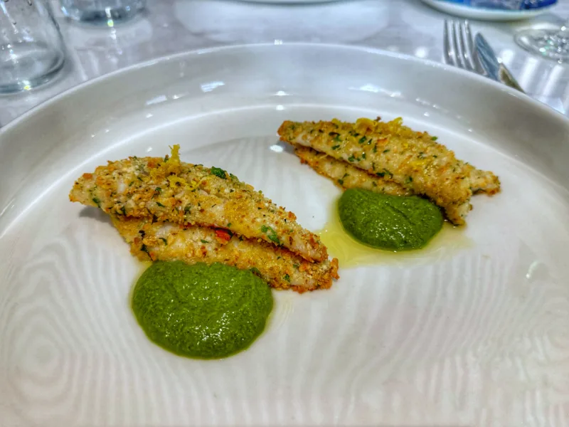Tra i secondi, la triglia in toriera gratinata con patata disidratata, pan grattato, e salsa verde al prezzemolo, olio di acciughe e oliva nera, è riuscito. La carne ha cottura perfetta. Croccanti, asciutti e saporiti sono i calamari fritti. Un segreto è la farina di riso per l’impanatura.