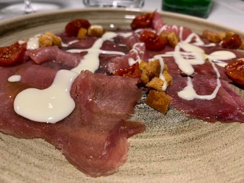 Bistrot di Pescheria – Carpaccio di tonno con pomodorino semidry e crema di gorgonzola
