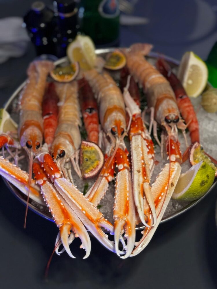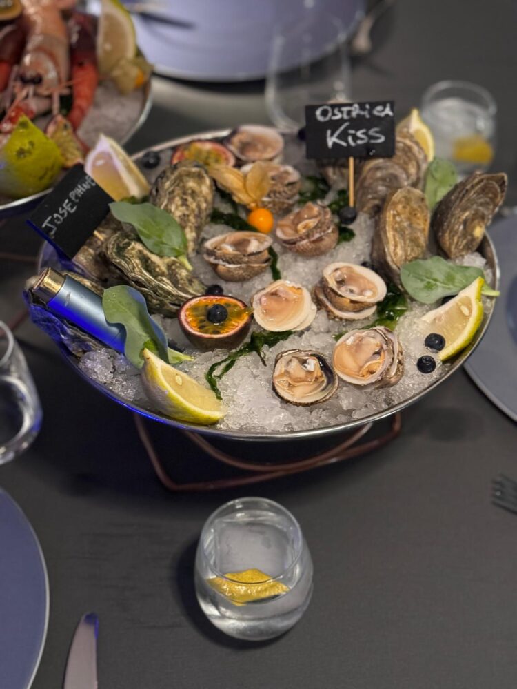 Coraggiosi gli accostamenti con la frutta, acidità e dolcezza dei crostacei creano un bel movimento ondulatorio, sì proprio come quelle ondine lì, a pochi metri. Le ostriche e i taratufi, per chi lo gradisce, decisamente io, possono essere accompagnati anche da un puff di gin.