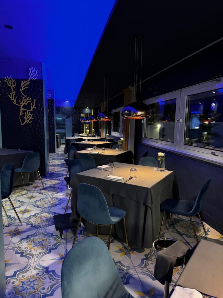 La sala interna, fedele al naming, ricorda un vero e proprio acquario. Coralli di design alle pareti se la giocano con gli specchi inclinati che grazie a un gioco ben pensato di luci riflettono il mare poco distante.