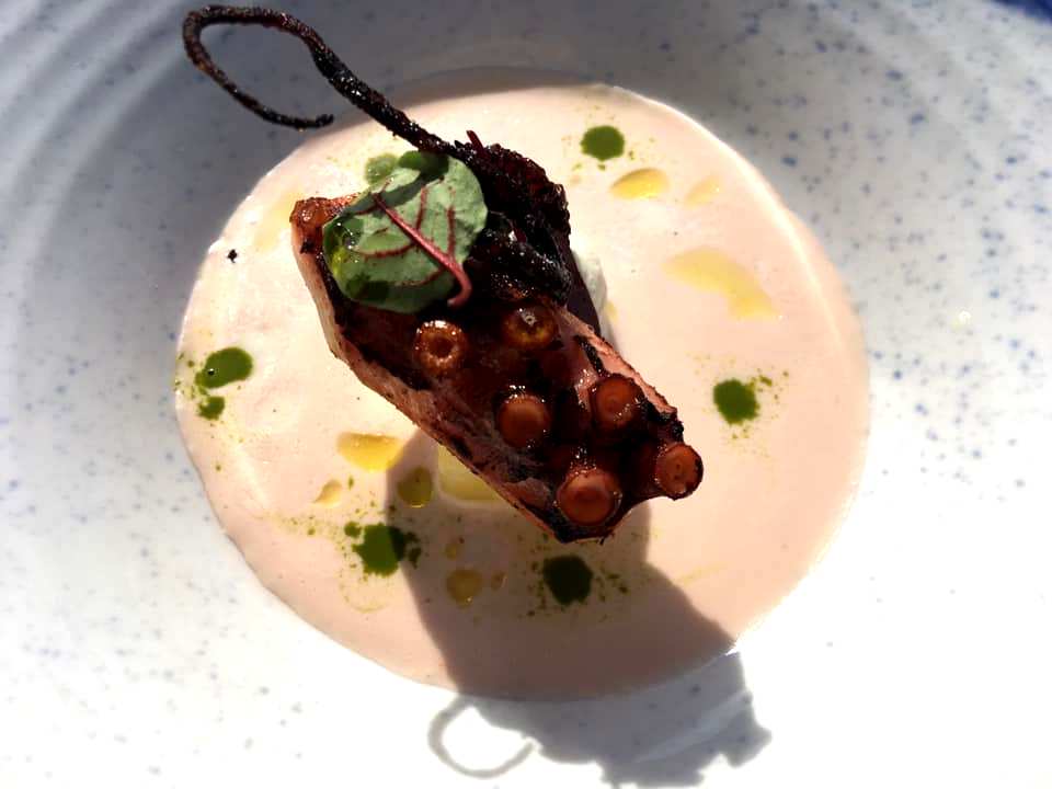 Semplice e ben eseguito il polpo scottato, su Aioli della sua acqua. Due componenti sul piatto. Ho già detto essenzialità?