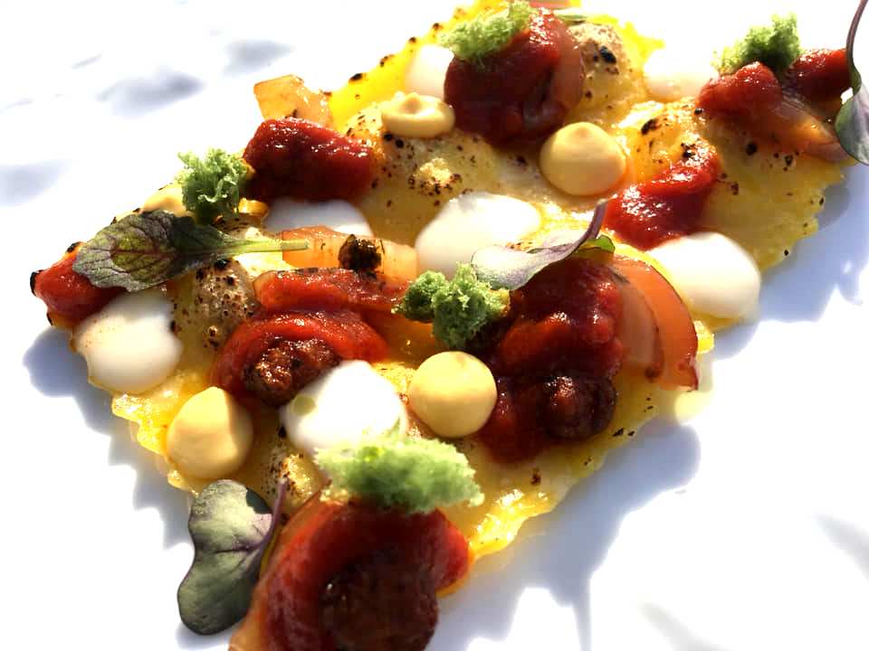 Incipit, sovverto l’ordine di degustazione, partendo da un piatto che mi ha letteralmente sconvolto. L’uovo in purgatorio secondo Roberto Lepre, un purgatorio interno. Ad un primo sguardo si noterà questa provola salsata, la spugna al basilico le note estetiche, ma rompendo l’uovo barzotto si dischiuderà un tuorlo morbidissimo ed un cuore di ragù molto ristretto, un pomodoro acidulo, concentrato e prorompente. Un piatto davvero ben studiato in cui la tecnica e l’idea sono completamente asservite al gusto.
