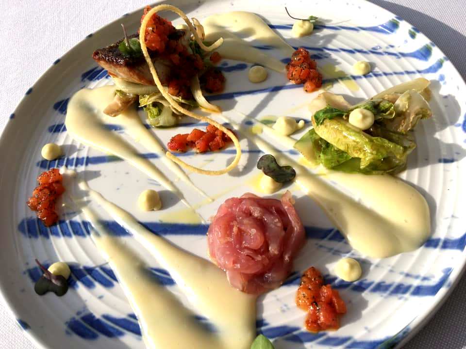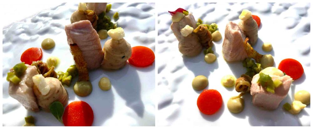 Pulita e dettagliata la versione rivisitata della caponata stabiese. Tonno marinato in aceto di lamponi, dadolata di olive verdi di nocellara, melanzana sott’olio artigianale, purea e crouton di biscotto di castellammare. Decisamente più leggera rispetto alla controparte tradizionale. Anche quì si palesa un’elevato indice di ideazione asservito alla buona riuscita del piatto. Roberto Lepre dimostra un ego più rivolto alla soddisfazione del cliente che alla propria, una virtù troppo rara nel mondo contemporaneo della cucina, quella vista dietro alle stufe.