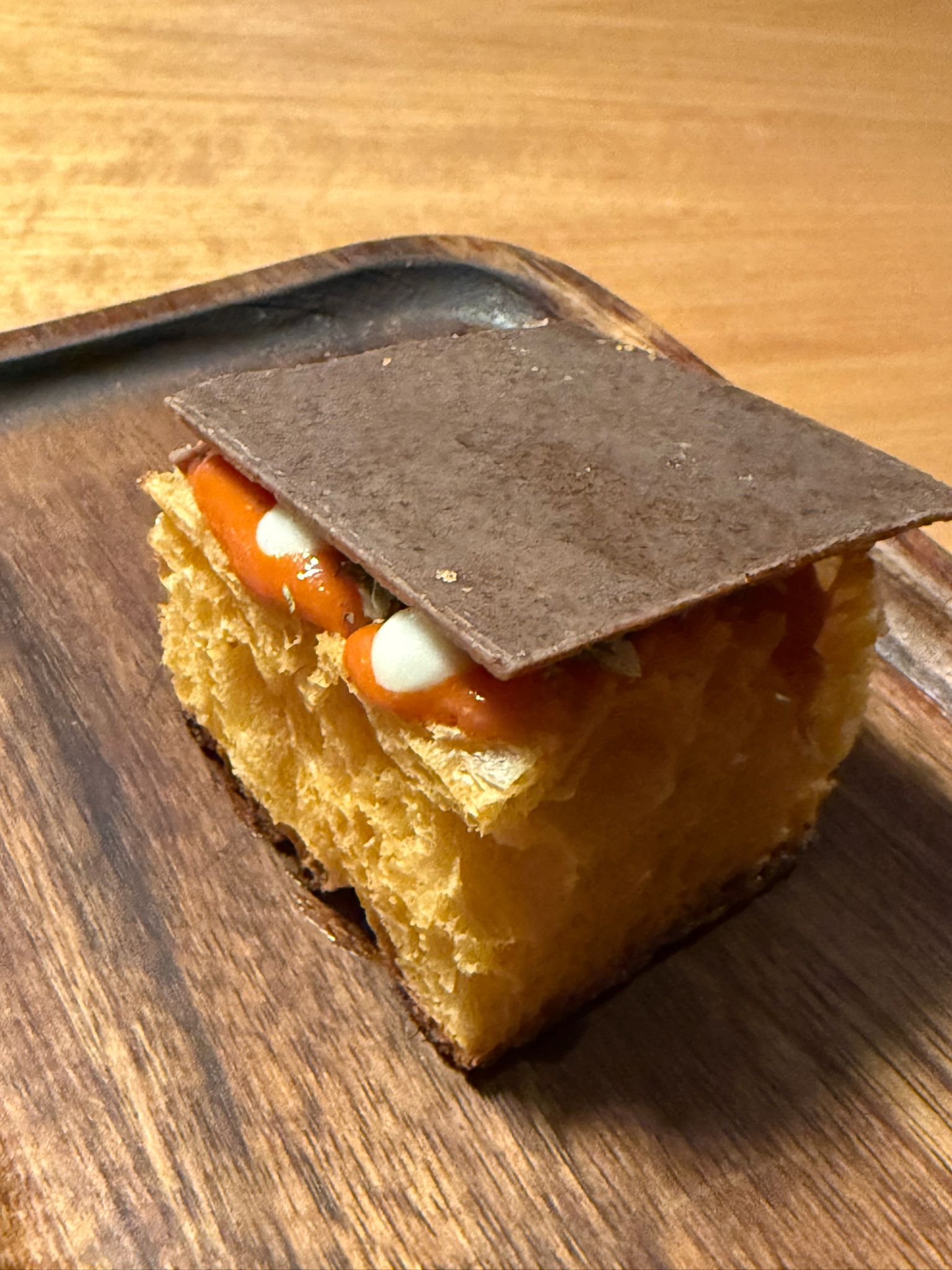 - La super Marinizia. Focaccia di pomodoro e burro, con sopra le alici marinate in salsa ponzu (dello chef e patron di Qafiz Nino Rossi), crema di pomodorini arrosto affumicati, crema di basilico, aglio blanco fatto con mandorle di Amendolara, origano, capperi croccanti e un biscotto di olive nere e liquirizia. Due morsi perfetti, per intensità dei sapori, consistenza, esplode in bocca. Meravigliosa.