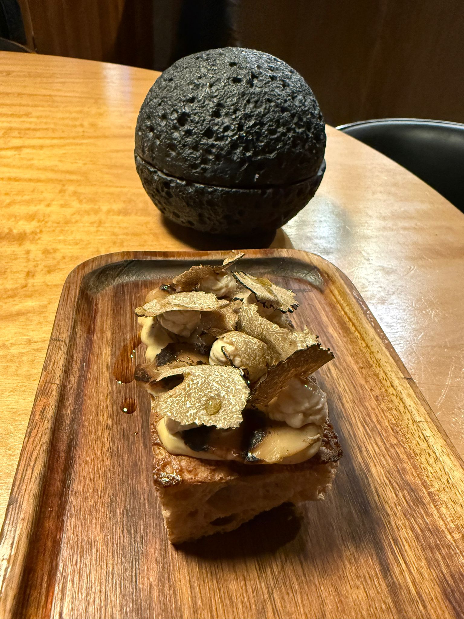 - Nocciola e funghi, brodo di miso e funghi. Altro lavoro concettuale, molto ben riuscito. Bisogna intingere la fetta nel brodo, una combinazione che esalta il quinto gusto, l’umami. Un lavoro di precisione nel gusto, che valorizza al meglio due risorse della Calabria, le nocciole e i funghi, senza aver paura di contaminarsi con altre culture.