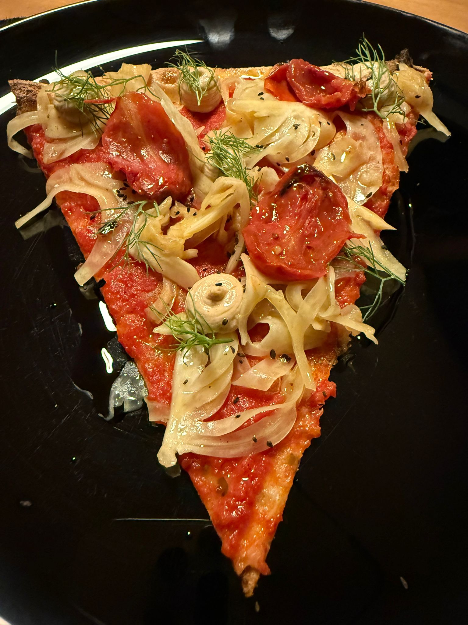 - La super Marinizia. Focaccia di pomodoro e burro, con sopra le alici marinate in salsa ponzu (dello chef e patron di Qafiz Nino Rossi), crema di pomodorini arrosto affumicati, crema di basilico, aglio blanco fatto con mandorle di Amendolara, origano, capperi croccanti e un biscotto di olive nere e liquirizia. Due morsi perfetti, per intensità dei sapori, consistenza, esplode in bocca. Meravigliosa.