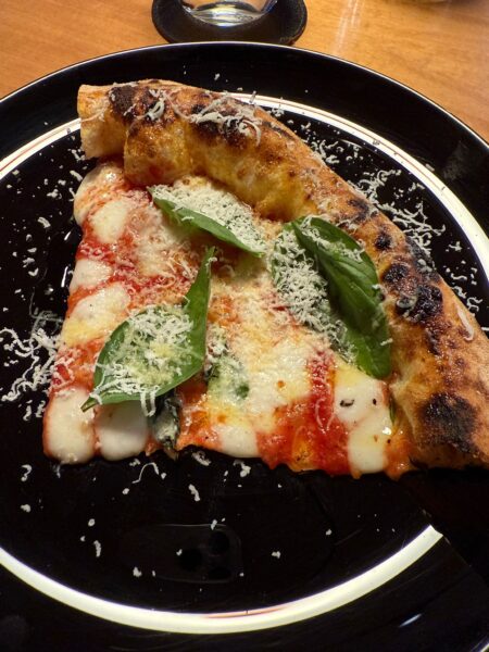 - La Margherita. Ottimo l’impasto, con un morso molto convincente, meno per la dolcezza del pomodoro. A mio parare nel bilanciamento tra gli ingredienti per la margherita la nota dolce/acida del pomodoro che dona freschezza è fondamentale, in questo caso risulta particolarmente dolce, buona si, ma troppo dolce, perdendo così una sfumatura importante se si parla di margherita.