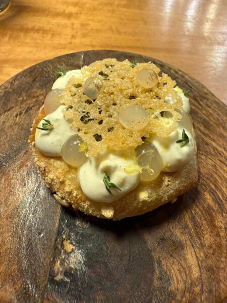 - La super Marinizia. Focaccia di pomodoro e burro, con sopra le alici marinate in salsa ponzu (dello chef e patron di Qafiz Nino Rossi), crema di pomodorini arrosto affumicati, crema di basilico, aglio blanco fatto con mandorle di Amendolara, origano, capperi croccanti e un biscotto di olive nere e liquirizia. Due morsi perfetti, per intensità dei sapori, consistenza, esplode in bocca. Meravigliosa.