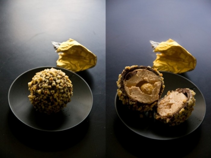 Versare in un contenitore la granella di nocciola. Poggiare la sfera di cioccolato e foie gras al centro della granella. A questo punto occorre un lavoro veloce e contemporaneo: con il cannello si fiammeggia velocemente la sfera e con l’altra mano (anche non direttamente, spingendo solamente il contenitore) si fa aderire la granella di nocciola al cioccolato. Per capire tutto il procedimenti basta guardare qui. Io ho modificato la ricetta ma usato lo stesso procedimento.