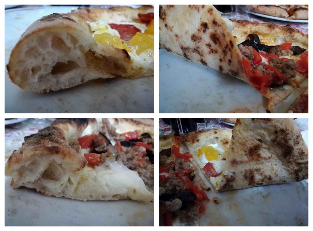 Per innalzare la temperatura del forno e per mantenere i ritmi del sabato, la fiamma nel forno è viva ma, pur facendo abbronzare un po’ di più il cornicione, consente un’ottima cottura dell’impasto senza far irrigidire il disco (che si piega senza scrocchiare e senza rompersi sorreggendo a dovere gli ingredienti disposti sopra) e facendo innalzare i cornicioni con tanti cunicoli pieni d’aria.