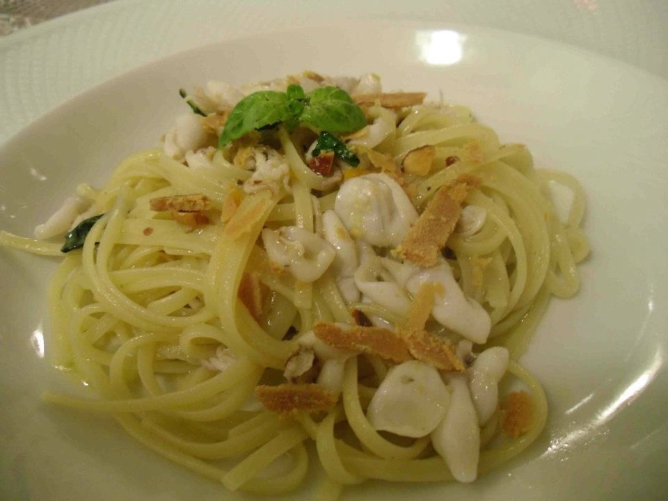 Meno incisivo il primo piatto, linguine con calamaretti e bottarga di orata, anche se ho capito che le linguine sono il formato preferito dello chef. Ad ogni modo qui viene utilizzata solo pasta di grande qualità, con i produttori riportati a pie’ di pagina del menu. Tra i secondi piatti, il pesce spada alla “Ventotene”, la zuppa di pesce locale espressa (che è il loro piatto del Buon Ricordo) e una riuscita combinazione di mare e verdura con le sfoglie di orata “pescata” con patate e melanzane.