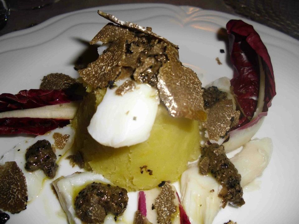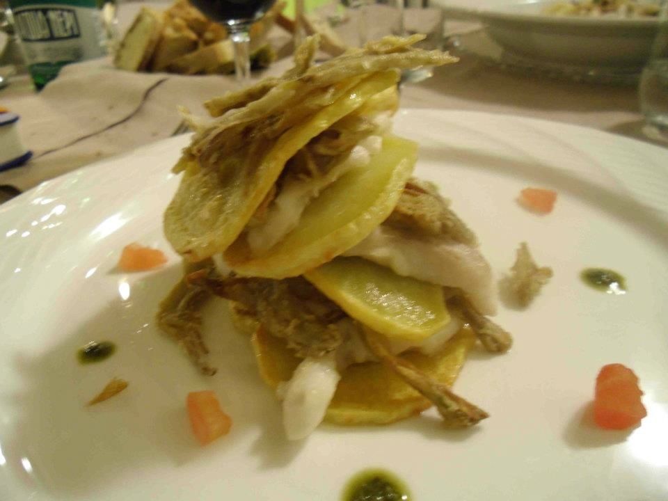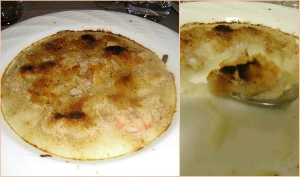 Cominciamo con un benvenuto composto da un mini carpaccio di orata e sedano, una zuppetta marinara di cicoria e un’ottima crema di patate rosse con capitone. A questo punto la strada del mare è presa (ma ci sono anche diversi piatti di terra, a partire dalla carne bufalina locale) e proviamo la schiacciatina di patate con baccalà e tartufo nero della Semprevisa, dai sapori resi netti e decisi grazie ai tempi di cottura indovinati e, ovviamente, dalla qualità della materia prima. Ho trovato davvero golosa la zuppa di cipolle con gamberi al gratin, resa più delicata e corposa grazie all’aggiunta di patate. Buon equilibrio tra gli ingredienti, con un rispetto assoluto per la freschezza dei gamberi, nonostante la gratinatura in forno.