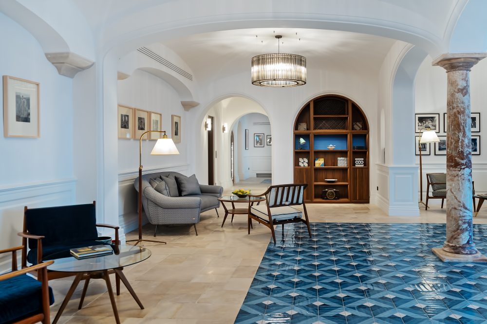 È proprio l’azzurro del mare che predomina su pavimenti, arredamenti su misura e ceramica vietrese, molta della quale realizzata in esclusiva da uno dei più grandi artigiani locali, Lucio Liguori.