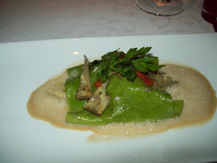 Il menu “Surprise” , piatti scelti dallo chef – non prima che il personale di sala si sia accertato di intolleranze e gusti personali – inizia a comporre la sua struttura con un astice tiepido con asparagi e piselli, avvolto in una delicatissima spuma; piatto delizioso nel quale si percepiscono distintamente sapori e profumi di ogni singola materia, legati in magistrale fusione.