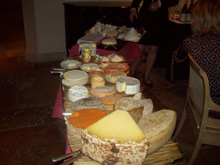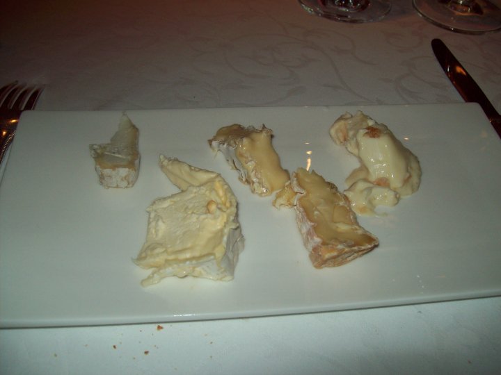 Ma il nostro palato si lascia viziare ancora. Durante tutta la cena vediamo transitare un enorme vassoio tenuto ai lati opposti da due persone, carico letteralmente di ogni bendidio derivato dal latte di ogni parte di Francia, affiancato da un altro grande piatto pieno di torrette e piramidi di caprini di differenti stagionature. Quando arriva il nostro turno siamo già ben sazi, ma come scritto in calce ai menu: “la gourmandise commence quad’on n’a plus faim”…. Lo affrontiamo con energia, ben ripagati dalla qualità dei prodotti.