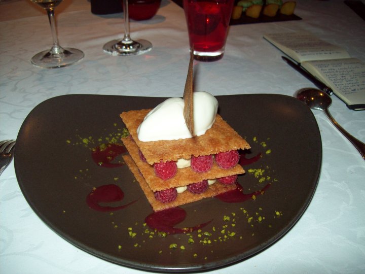 Nel menu Gourmand ci servono una millefoglie di lamponi, capolavoro di equilibrio tra croccantezze e cremosità della salsa di pistacchi e del gelato al formaggio fresco di capra.