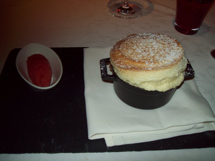 prima che ci vengano serviti degli scenografici Soufflè caldi al Grand Marnier con sorbetto di arance: una nuvola soffice e delicatamente profumata dal liquore, superbamente contrappuntata dall’agrume freddo.