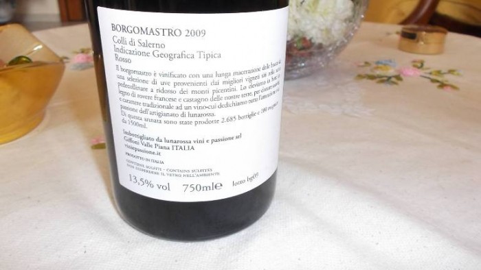 Il Borgomastro 2009, di cui sono state prodotte appena 2.685 bottiglie, ha trascorso tre anni a maturare prima in legno di rovere e di castagno e poi in boccia. La gradazione alcolica è di tredici e mezzo.