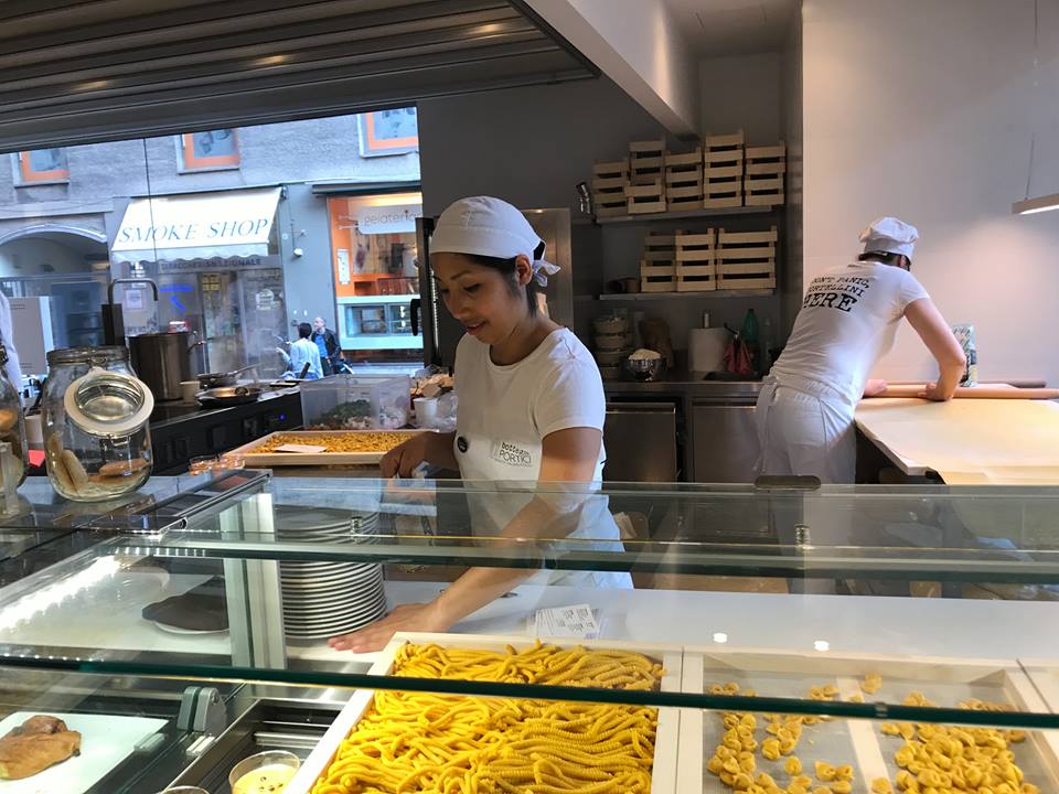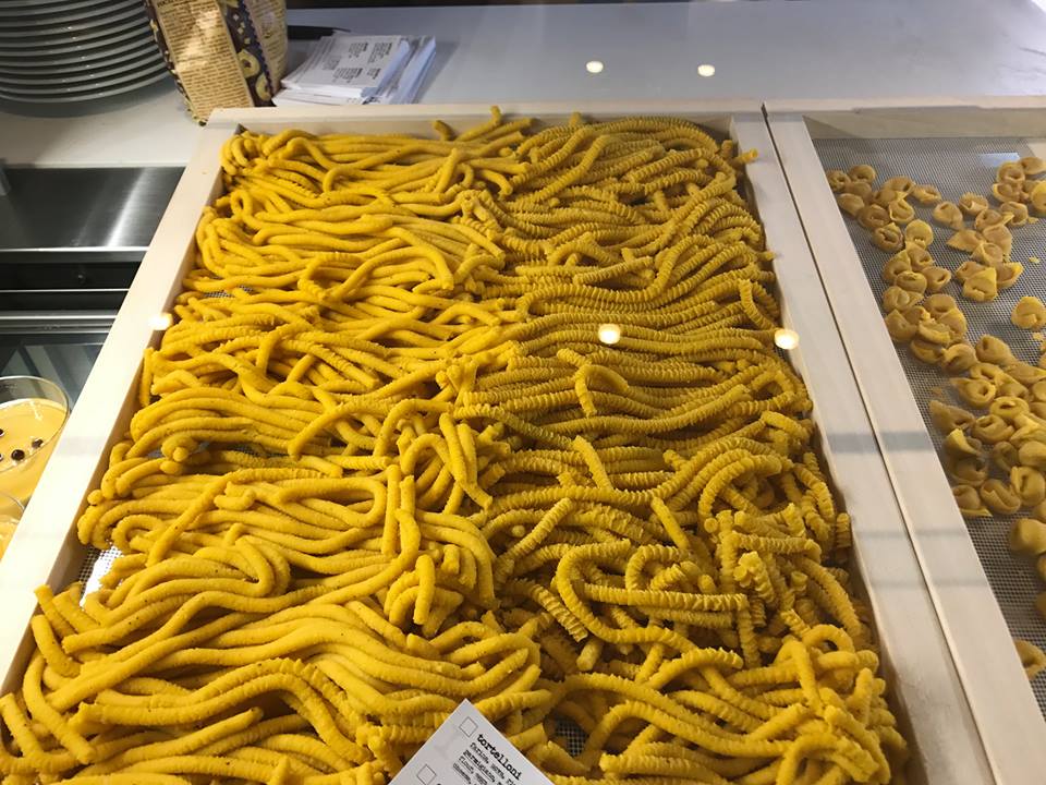 Chef è Elia Frascella, allievo di Agostino Iacobucci: tagliatelle al ragù, gnocchi al pomodoro, tortellini in brodo e tortelloni burro e salvia. Il caffè con le miscele di Manuel Terzi, botteghe di pasta, olio, formaggi, conserve, zuppe da portare a casa.