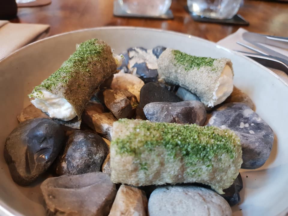 Tecnico e preciso il piatto che mette insieme varie proteine vegetali quali piselli, latte di mandorla, tartufo estivo, germogli di piselli. Troviamo una stratificazione di consistenze e note grasse vegetali ben integrate dall’uso del tartufo che ne valorizza la delicatezza donando profondità ed equilibrio. Tante parole per dire che era buono e piacevole.