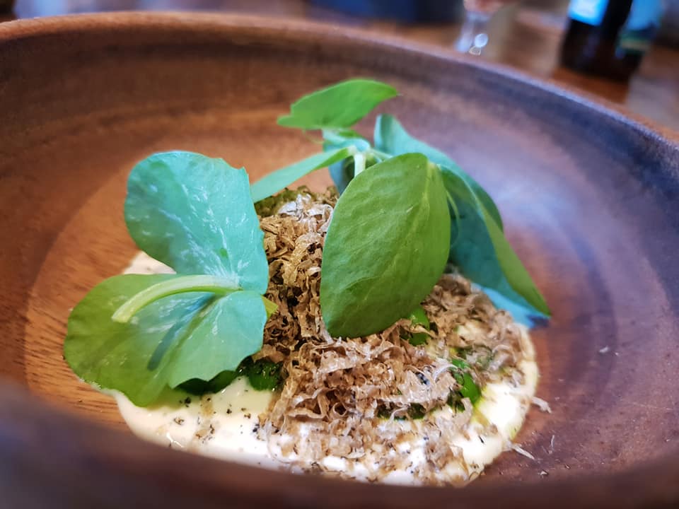 Tecnico e preciso il piatto che mette insieme varie proteine vegetali quali piselli, latte di mandorla, tartufo estivo, germogli di piselli. Troviamo una stratificazione di consistenze e note grasse vegetali ben integrate dall’uso del  tartufo  che ne valorizza la delicatezza donando profondità ed equilibrio. Tante parole per dire che era buono e piacevole.