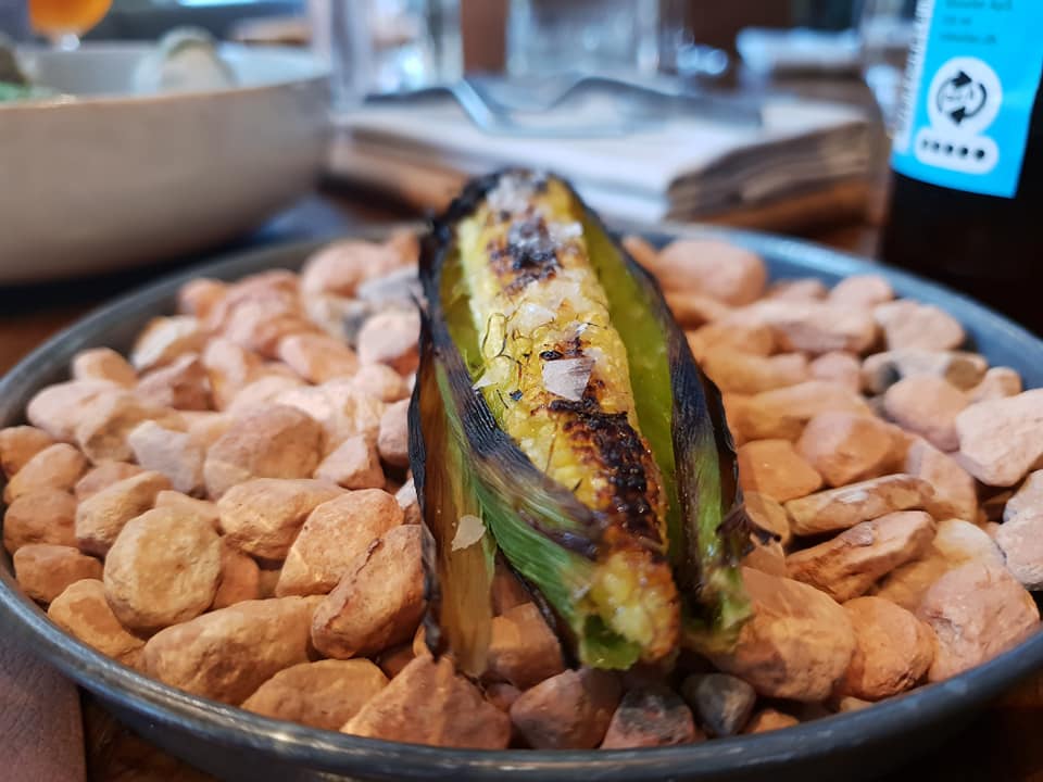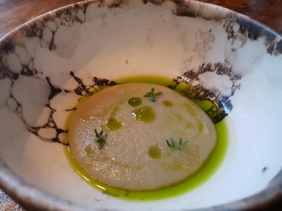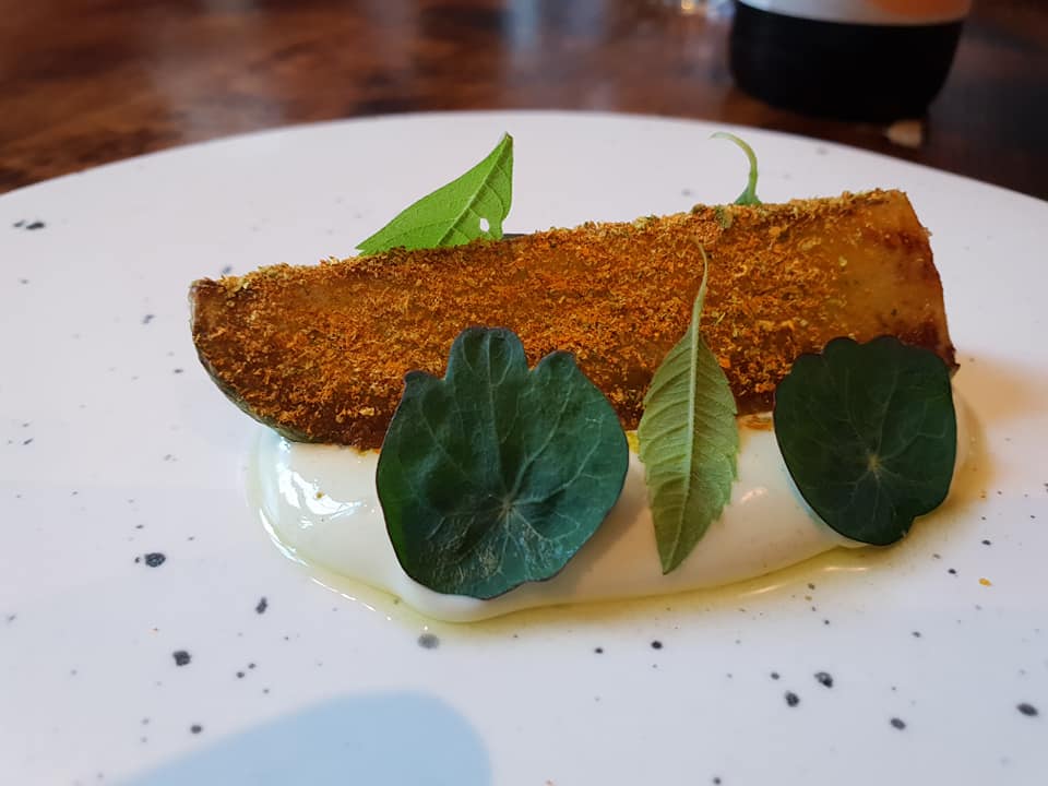 Tecnico e preciso il piatto che mette insieme varie proteine vegetali quali piselli, latte di mandorla, tartufo estivo, germogli di piselli. Troviamo una stratificazione di consistenze e note grasse vegetali ben integrate dall’uso del tartufo che ne valorizza la delicatezza donando profondità ed equilibrio. Tante parole per dire che era buono e piacevole.