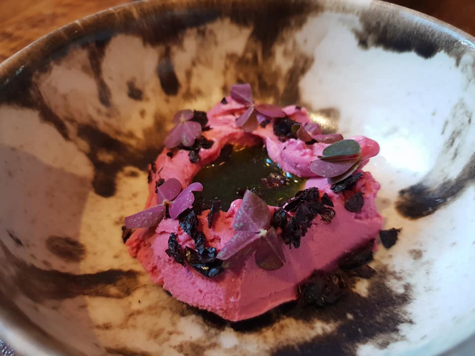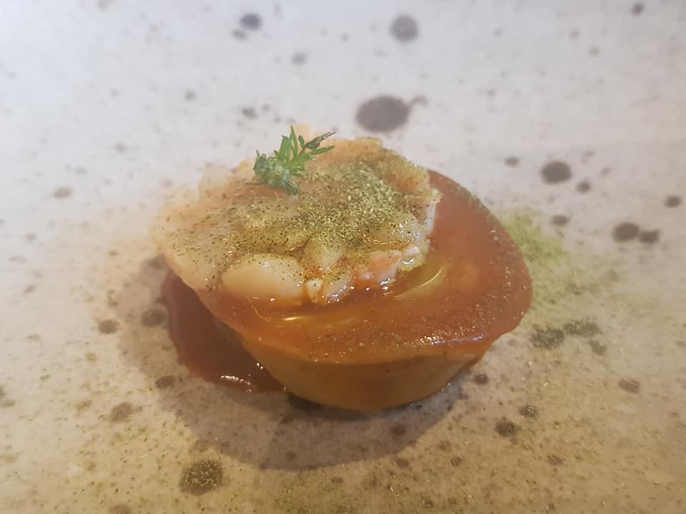 Torna l’uso di una proteina animale con il raviolo ripieno di pomodoro confit, ananas e camomilla con tartare di astice. Pasta ben fatta, gusto che si estende nel panorama dell’acido fresco e fruttato controbilanciata anche dalla dolcezza del crostaceo.
