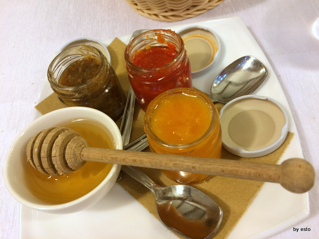 Confetture vesuvuiane di pellecchiella, pomodoro del piennolo e peperoncino, cachi alla vaniglia e caffè.