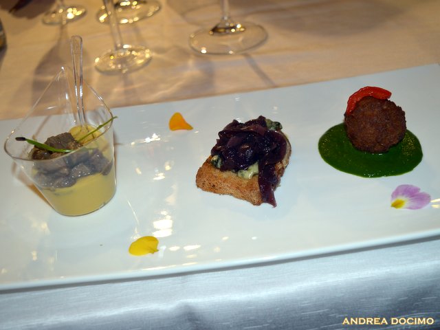 Una delicatissima vellutata di ceci allo zafferano (per nulla invadente) con del saporito e croccante guanciale di Marchigiana, un crostone di pane cafone con Blue Stilton e cipolla di Tropea caramellata sfumata con del Cabernet e dell’aceto balsamico ed infine una golosa polpettina di marchigiana su crema di friarielli con una julienne di papaccelle. Il modo migliore per iniziare la cena.