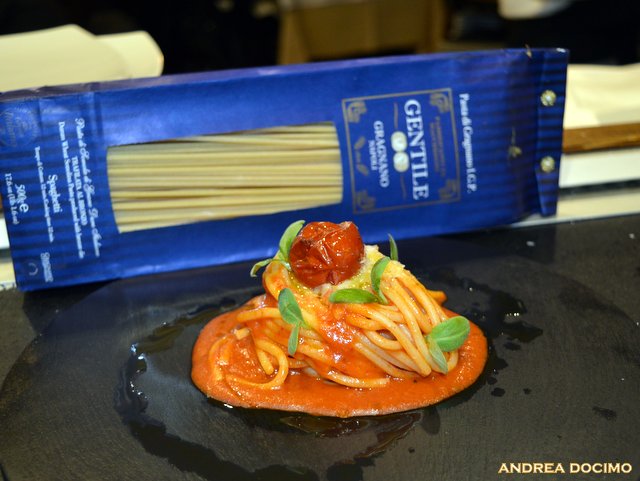 Luciano, Francesco e L’Insolito Pasto da Braceria Bifulco. Spaghetti del Pastificio Gentile con i pomodori DAMA di Marianna D’Auria e Provolone del Monaco.
