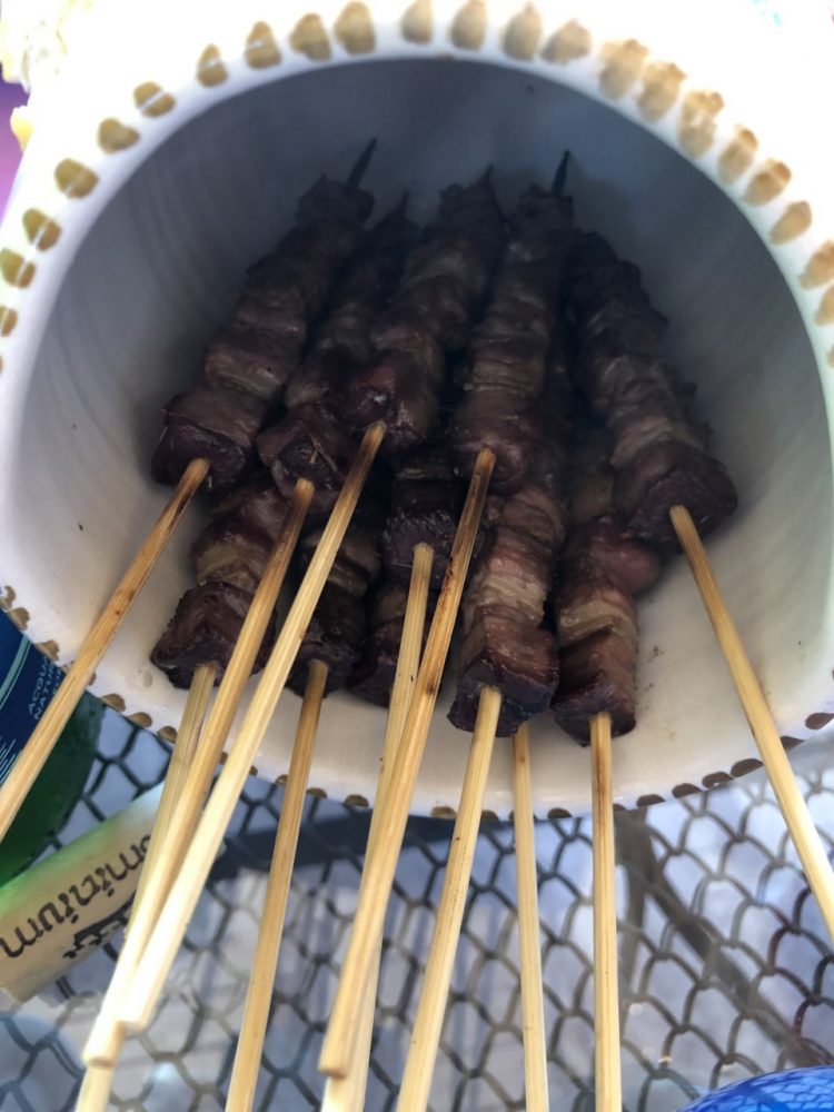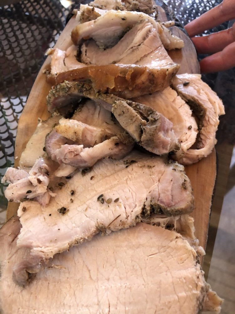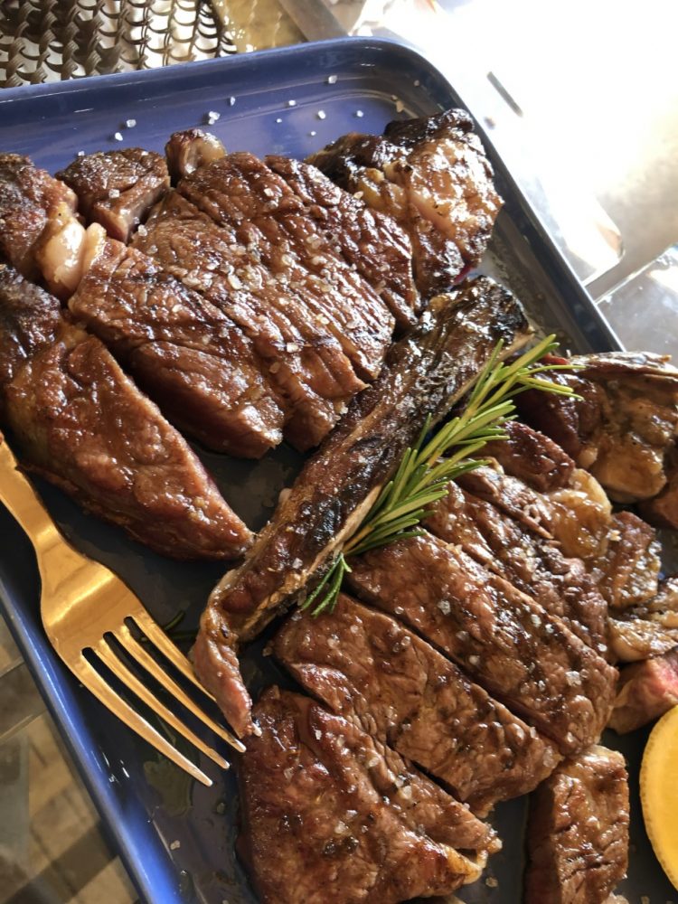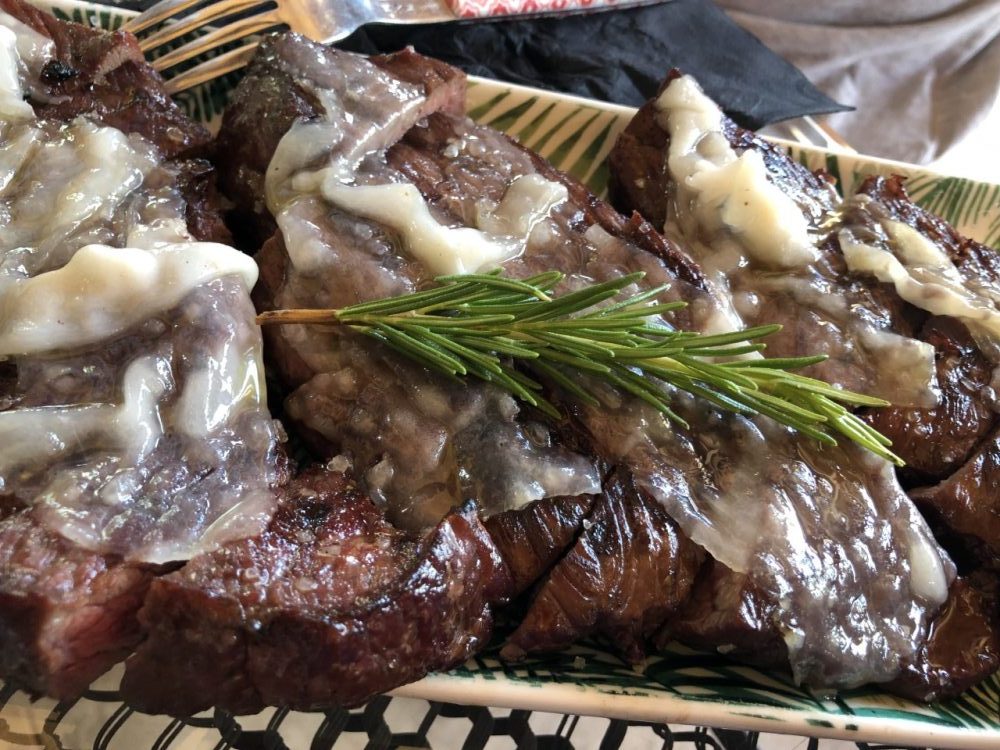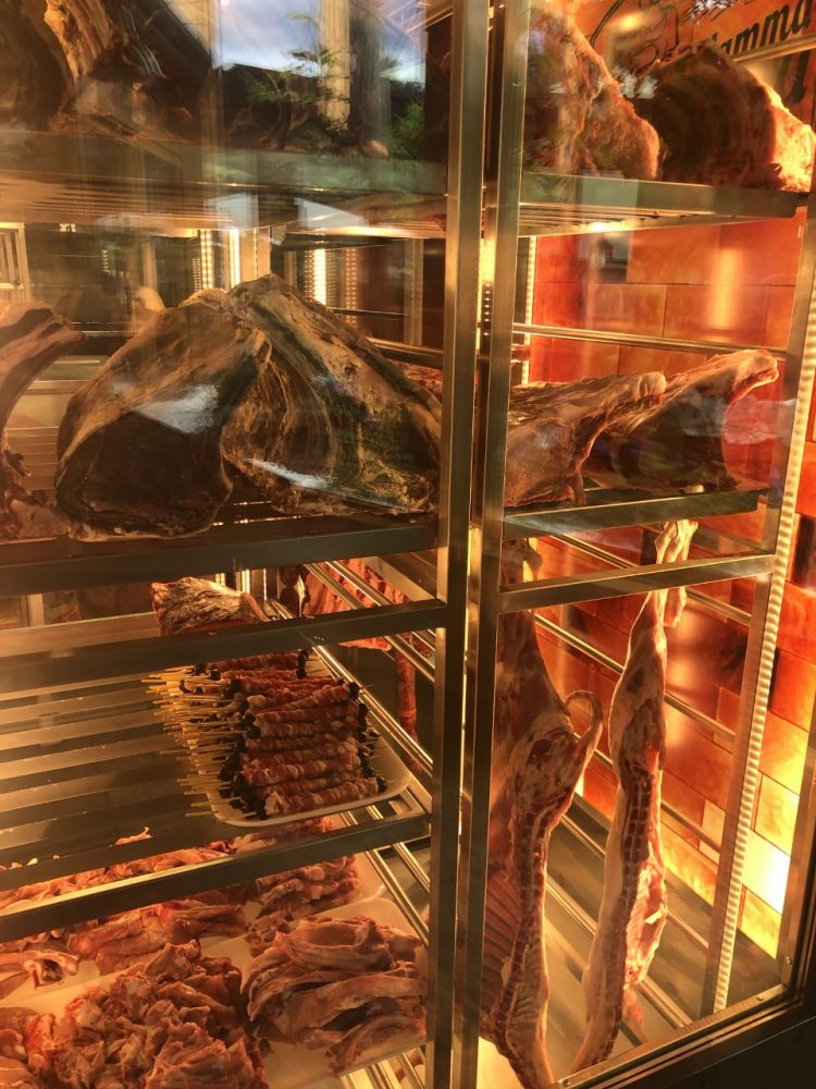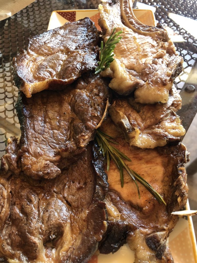 Poi dalla cella di maturazione a vista, Alessandro tira fuori una bistecca ed una picanha (codone di manzo) di chianina. Succose, saporite, e finalmente, locali per davvero. La carne, chianina o marchigiana, viene allevata a due passi da qui, come pure gli agnelli e i maiali neri.