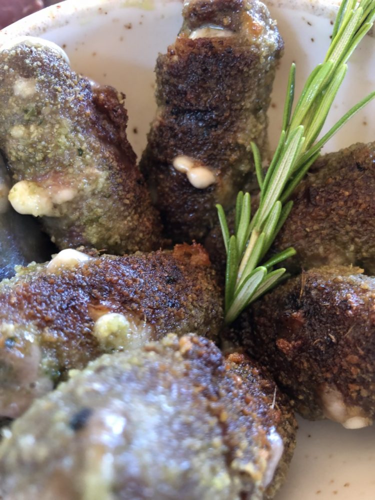 La braceria Mamma Giovanna, sta a pochi metri da una strada statale ma dal giardino interno e dalla piacevolissima sala, neanche ve ne accorgerete. Federica è molto graziosa ed empatica e pronta ad accontentare l’ospite, davvero brava. Alle carni pensa Alessandro, ragazzo serio e sveglio. Niente primi ma tanti antipastini sfiziosi: tagliere di salumi della loro macelleria (propri maiali e trasformati da loro), tra cui uno strepitoso prosciutto, buonissime coppiette e una maialosissima porchetta, buone polpettine, a cui mancava un pizzico di croccantezza, eccellenti bombette ripiene di caciocavallo di Capracotta, gli immancabili arrosticini di ovino e di maiale, un po’ di “carne salada”, una zuppetta di ceci e crostini a ricordarci che non di sola carne vive l’uomo e, uber alles, un incredibile spezzatino di chianina.