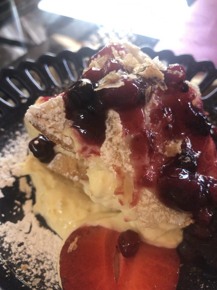 Una patata al forno e due verdurine, per finire l’ultimo dito di vino prima del dolce. Per me millefoglie con crema chantilly e un goccio di genziana artigianale.