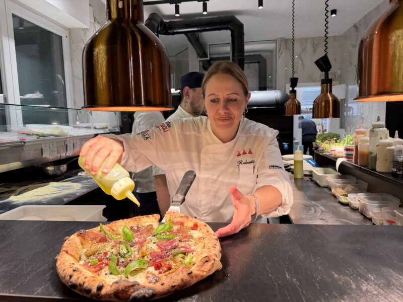 Al centro, la pizza di Roberta Esposito, dal carattere riconoscibile. Un’identità costruita negli anni, pizza dopo pizza, che oggi si esprime in un linguaggio attuale e personale. Cresciuta tra Napoli e il Casertano, si avvicina alla pizza passando prima dalla sala, come sommelier, nel ristorante di famiglia La Contrada ad Aversa (44° posto nella 50 Top Pizza Italia 2025), per poi orientarsi al banco e forno. Studio degli impasti, ricerca continua e libertà espressiva — accompagnata da una misurata audacia — la portano a ottenere importanti riconoscimenti. Oggi si divide tra Aversa, Roma e Gioia del Colle. Da Brando mette a sistema tutto il suo percorso. Qui definisce anche una nuova direzione stilistica: “La Sottile di Roberta”, una pizza più sottile e croccante, dalla cottura asciutta, che richiama la leggerezza dello stile romano ma trova un proprio equilibrio nel contesto pugliese. Ne nasce un registro personale che i clienti apprezzano e chiedono e che affianca il suo disco napoletano contemporaneo.