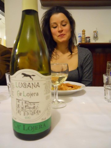 Tra i piatti tipici da provare c’è poi il casancello ( quadratino di pasta fresca ripieno di carne e prosciutto condito con burro e salvia), lo stracotto di asino, la coppa ripiena, la trippa in zuppa con verdure, la pappa al pomodoro, le lumache in umido . E poi i formaggi bresciani conservati nella vecchia cantina: il bagos di Bagolino nella Val Sabbia fatto con latte di vaccina e profumato allo zafferano e il fatulì formaggio di capra prodotto nella Valle Camonica. Il menù di oggi propone gli gnocchi di patate al pestom (impasto fresco del salame) ed i malfatti, degli gnocconi di patate e spinaci dall’aspetto piuttosto grossolano, conditi con burro e salvia ai quali abbiamo abbinato un Lugana 2010 di Ca’ Vojera dalla bellissima etichetta disegnata da Angelo Peretti.