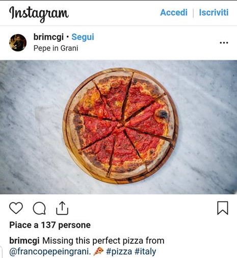 Sulla pizza nel ruoto di Franco Pepe, “Missing this perfect pizza” (mi manca questa pizza perfetta di Franco Pepe), provata per colazione, dopo aver dormito nella pizzeria n°1 al mondo per 50 top pizza.