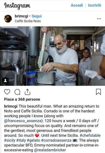 Last but not least, una foto di Corrado Assenza scrivendo: Corrado is one of the hardest working people I know (along with @francesco_assenza): 120 hours a week / 0 days off / uncompromising focus on quality. And remains one of the gentlest, most generous and friendliest people around. (Corrado è una delle persone che lavorano più duramente che conosco (insieme a @francesco_assenza): 120 ore alla settimana / 0 giorni di riposo / attenzione incondizionata alla qualità. E rimane una delle persone più gentili, più generose e amichevoli in circolazione).
