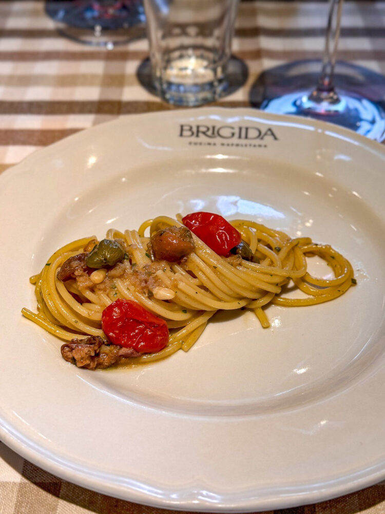 Lo Spaghettone alla Gravunaro, piatto nato negli anni 40, con mollica di pane insaporita con acciughe, capperi, olive e pinoli è l’esecuzione di un pezzo di storia, lo spaghetto con il bavaglino, perché dovete sapere che da Brigida un rito accompagna questo piatto: il personale di sala annoda attorno al collo dell’ospite una bavetta per poter abbandonarsi al piacere della forchettata senza macchia.