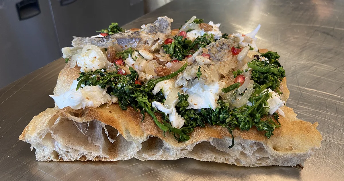 Stendere l’impasto su una teglia di ferro leggermente oleata, avendo cura di non far uscire l’aria incamerata in esso. Cuocere in forno ad una temperatura di 290 °C per circa 10 minuti. Negli ultimi 2 minuti di cottura, aggiunger la base di broccolo Fiolaro e il fiordilatte. A cottura ultimata, aggiungere a freddo le sarde in saor, alcuni grani di melograno e il pane grattugiato. Completare con qualche cristallo di sale Maldon.