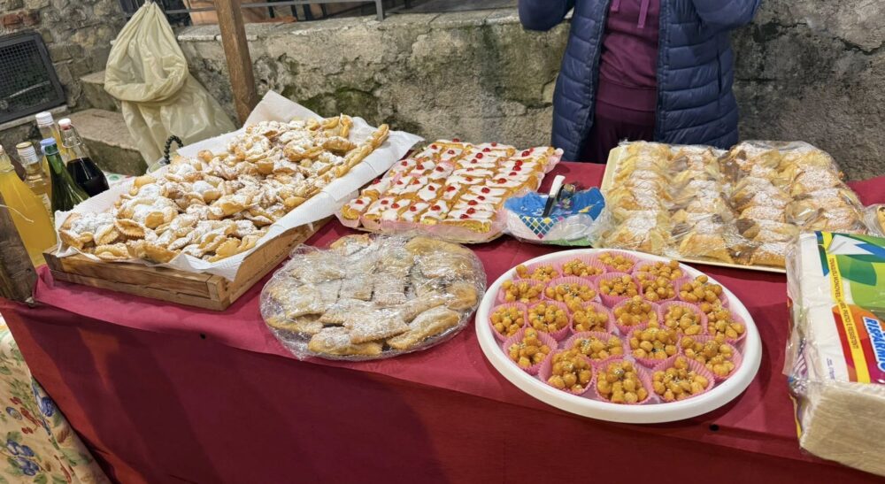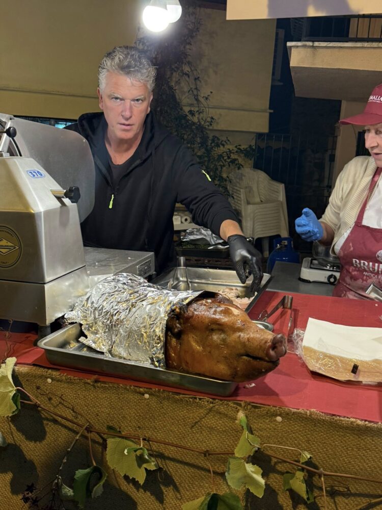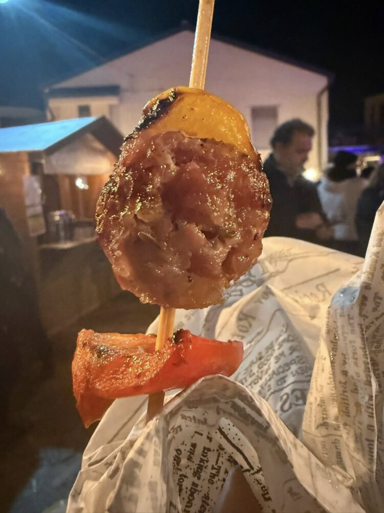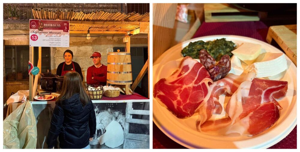Il primo stand, ovviamente quello dei Moresani, con Antonella, moglie di Carmine che proponeva zuppetta di fagioli e castagne, foglie e patate e gli immancabili salumi e formaggi. Qui piccola parentesi, mentre preparavano i salumi da portare c’ero anche io, e che ti scorgo nel banco refrigerato? Un capocollo, enorme, mostruoso che faceva bella mostra di sé, pur se costretto da una busta sottovuoto.