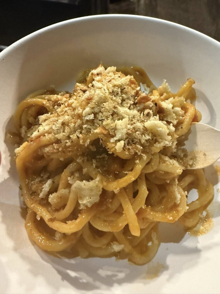 Ma io amo il porco e quindi il salsiccione arrostito di Carmine Rea, doveva essere mio e si conferma una delle cose più buone provate, insieme all’uovo di Marisa, che si chiama come mamma mia e, a quanto vedo,cucina anche come lei.